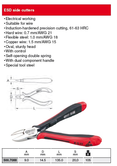 電氣工作 適用於電線 感應淬火精密切割,61-63 HRC 硬線:0.7 mm / AWG 21 靈活的鋼1.0 mm / AWG 18 銅線:1.5毫米/ AWG 15 橢圓形,堅固頭 與控制 自開雙春 隨著雙組件手柄 特殊工具鋼 技術參數 直徑D:14.5毫米 形式:直 功能屬性1:靜電放電ESD  屬性的功能2:電子 重g:105克 手柄:2組件手柄 頁主目錄:K15_288  總長度L毫米:135.0毫米 material1:特殊鋼 材料2:硬化 刀片:是 profil1:鉗子PROFIL,切割-  切割長度S毫米:20,0mm  頭(A)的高度:9.0毫米