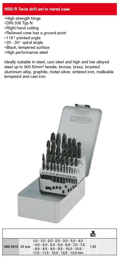產品 > 頂尖德國工藝 專屬工具KS Tools > 切割/ 鑽尾 / 攻牙 專屬工具 > HSS鑽頭集,25PCS,1-13MM